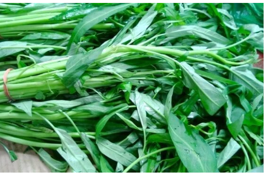 Water spinach, also called kang kong, has hollow stems and soft, tender leaves. It is usually stir-fried with garlic, chili, or fermented bean paste. Water spinach is also added to soups and hot pot dishes, providing a slightly earthy taste and a mix of crisp stems with soft leaves that balance richer ingredients.